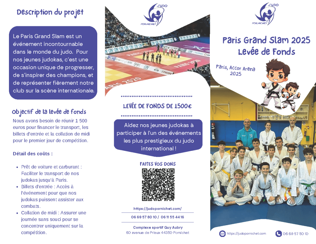 Nous avons une fabuleuse opportunité cette année : permettre à 5 de nos jeunes judokas de vivre une expérience unique en assistant au Paris Grand Slam 2025. Pour réaliser ce rêve, nous lançons une campagne de levée de fond, et avons besoin de votre soutien. L’OBJECTIF : réunir 1500 euros.