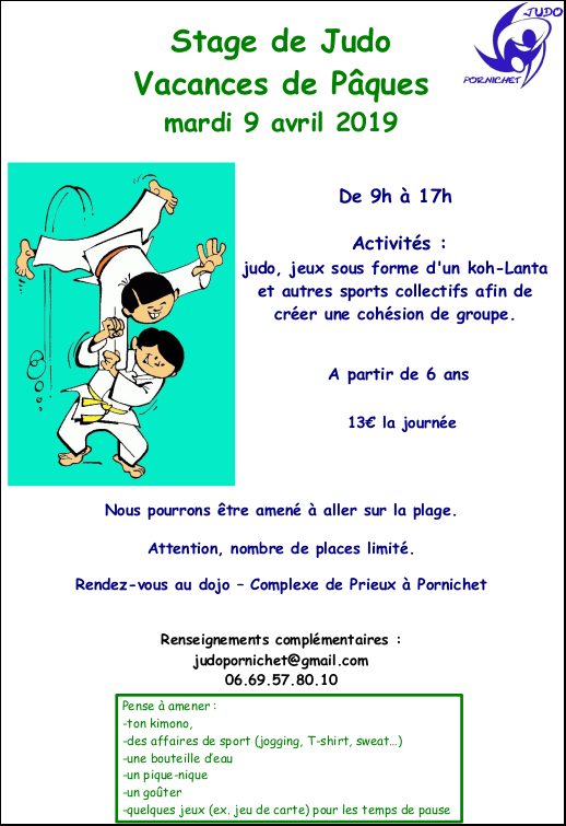 Modalité d'inscription : déposer le bulletin d'inscription (fichier joint) + règlement (13 euros par enfant) sous enveloppe dans la boite aux lettres disponible dans la salle de judo avant le 31 mars. Renseignements complémentaires : 06.69.57.80.10 ou judopornichet@gmail.com stage-de-judo-2019Télécharger