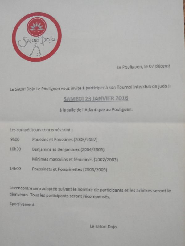 Le Satori Dojo Le Pouliguen invite notre club à participer à son tournoi inter-clubs de judo le Samedi 23 Janvier 2016, à la salle de l'Atlantique au Pouliguen. Les compétiteurs concernés sont : 9h00 Poussins et Poussines (2006/2007) 10h30 Benjamins et Benjamines (2004/2005) Minimes masculins et féminines (2002/2003) 14h00 Poussinets et Poussinettes (2008/2009)